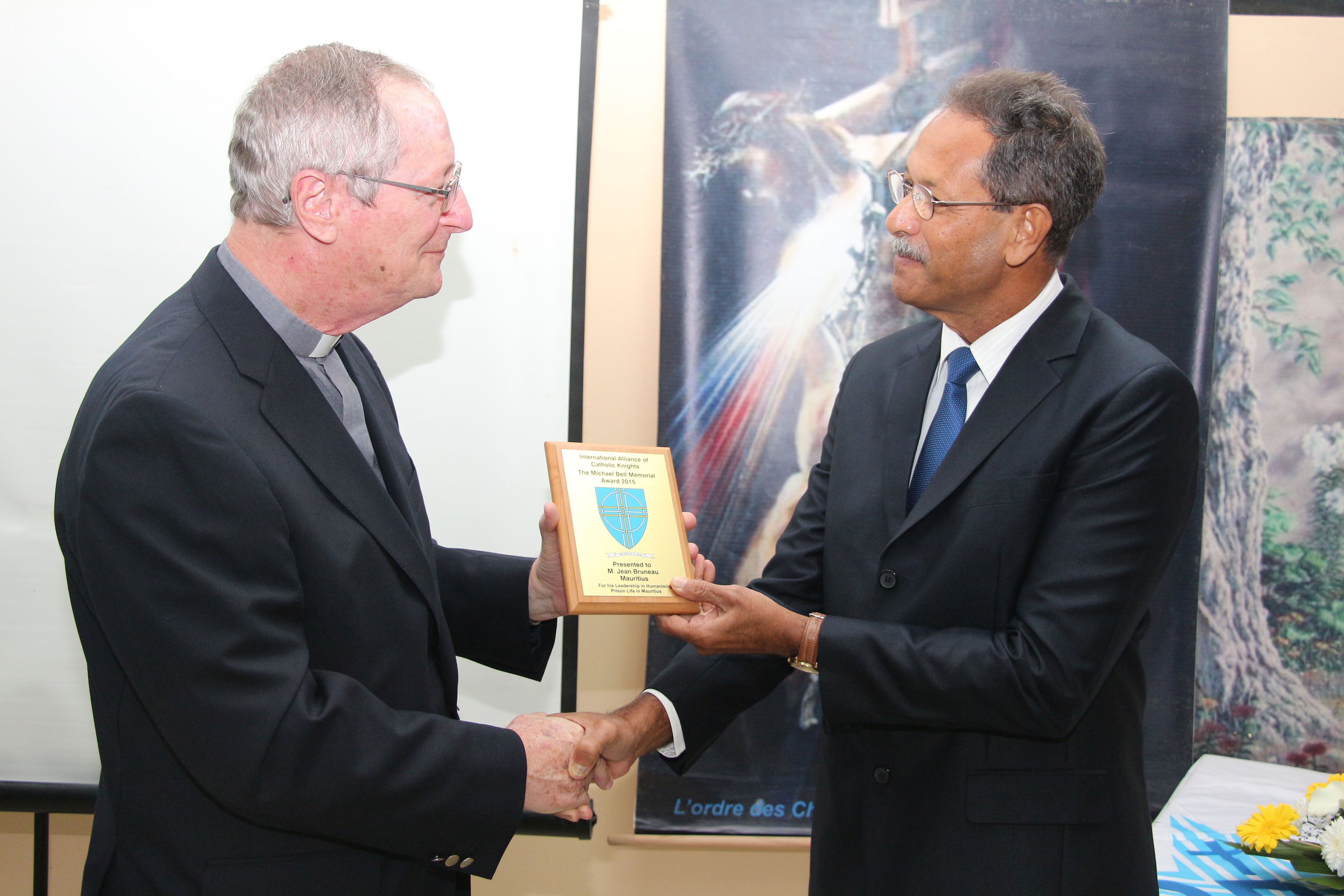 The award was presented by Brother Cyrl Fernand, Supreme Knight of the Order of the Knights of Mary Queen of Peace – L’Ordre des Chevaliers de Marie Reine de La Paix. The ceremony took place in the presence of His Eminence Maurice Cardinal Piat CSSp, Bishop of Port-Louis, Mauritius.